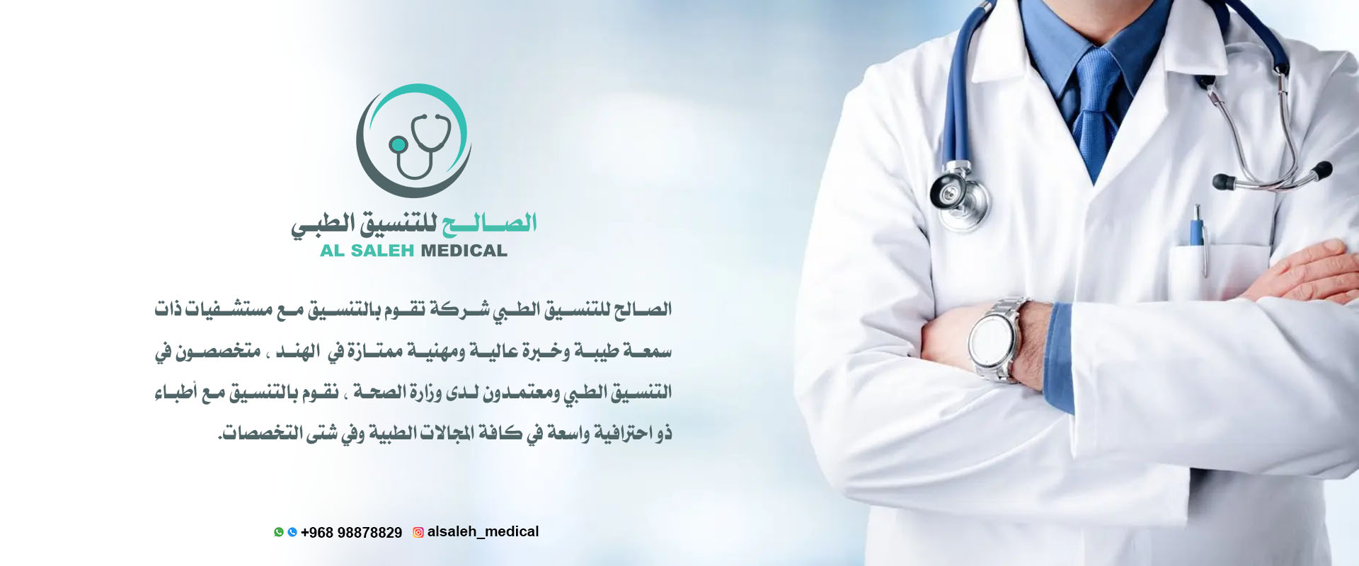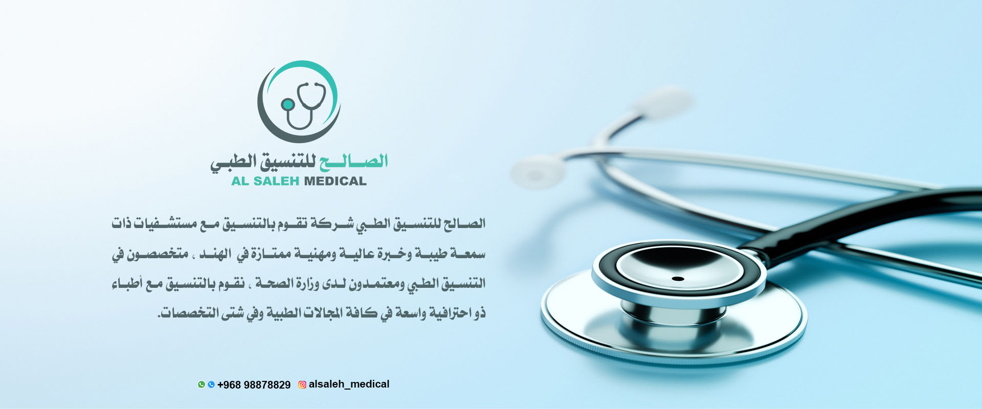 الصالح للتنسيق الطبي شركة تقوم بالتنسيق مع مستشفيات ذات سمعة طيبة وخبرة عالية ومهنية ممتازة في الهند ، متخصصون في التنسيق الطبي ومعتمدون لدى وزارة الصحة ، نقوم بالتنسيق مع أطباء ذو احترافية واسعة في كافة المجالات الطبية وفي شتى التخصصات